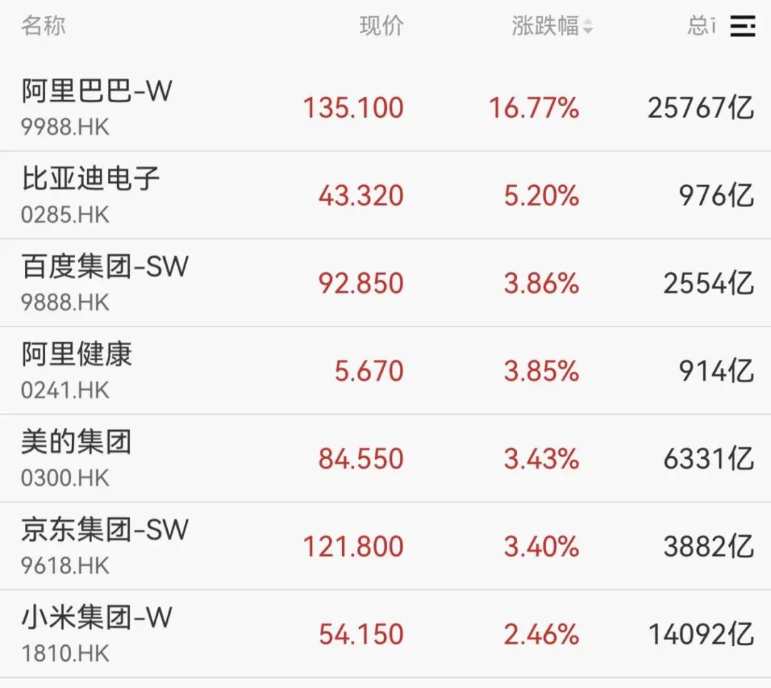 港股三大指数悉数走高,阿里巴巴大涨超16%,比亚迪(002594)电子、百度集团、阿里健康等涨超3%。