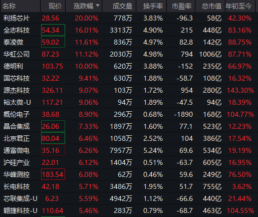 芯片、半导体板块走强,利扬芯片20%涨停,全志科技(300458)、泰凌微、华虹公司涨幅居前。